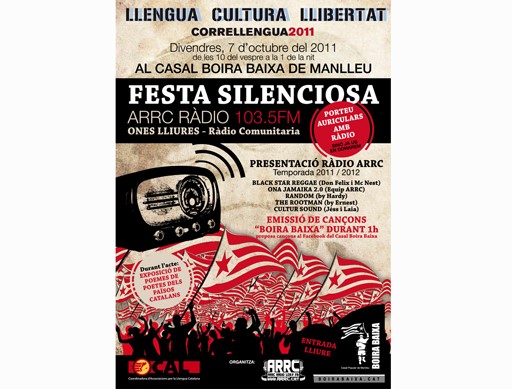 Aquest divendres, dia 7 d'octubre, a partir de les 10 del vespre el Casal Boira Baixa de Manlleu celebrarà una nova edició del Correllengua. Ho farà amb una Festa silenciosa a càrrec de Ràdio ARRC i una exposició de poemes dels Països Catalans.