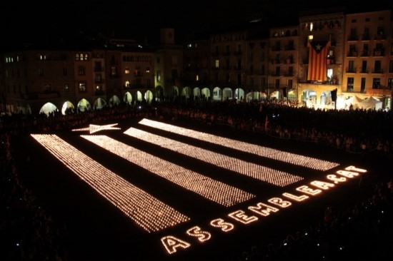 Centenars de persones s'han aplegat aquest dijous al vespre a la Plaça Major de Vic per veure en directe l'espectacle de llum que ha ideat l'Assemblea Nacional Catalana a la capital d'Osona. Els organitzadors han disposat unes 8.000 espelmes a terra en forma d'estelada gegant i al so del campanar, quan tocaven les 8 del vespre, el centenar llarg de voluntaris ha començat l'encesa que ha durat gairebé dues hores.