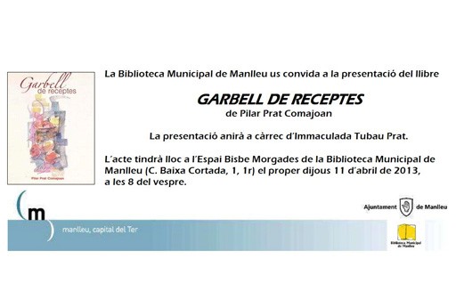 LEspai Bisbe Morgades de la Biblioteca Municipal de Manlleu acollirà dijous la presentació del llibre Garbell de receptes de la manlleuenca Pilar Prat Comajoan. Tota una vida rere el taulell li ha donat un profund coneixement de la cuina i dels plats més tradicionals.