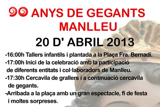 La festa començarà a les 4 de la tarda amb la plantada de gegants i tallers pels menuts. A les 5 de la tarda començaran els actes on participaran entitats com els Nyerros de la plana, la biblioteca, els sardanistes i les AMPA entre d'altres entitats. A 2/4 de 6 de la tarda s'iniciarà pels carrers de Manlleu la cercavila de grallers, novetat d'enguany, i tot seguit la cercavila de gegants, que està previst que també facin en Jordi i la Montserrat "que fa més de 40 anys que no surten a cap cercavila".