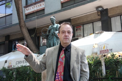 El periodista Jaume Collell davant de l'estàtua de la cupletista Raquel Meller, a l'avinguda Paral·lel de Barcelona