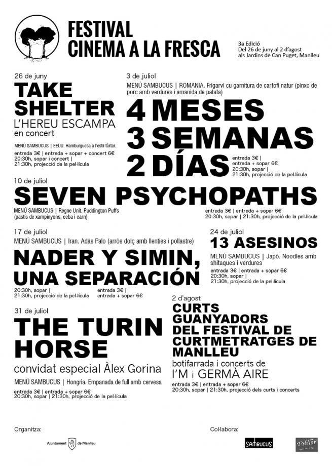 El 3 de juliol es podrà veure el drama romanès 4 meses, 3 semanas 2 días. El dia 10 serà el torn de la britànica Seven Psychopaths. Es continuarà el 17, amb la iraniana Nader y Simin, una separación i el 24 amb la japonesa 13 asesinos. El 31 de juliol hi haurà la projecció de la pel·lícula que va ser descrita com "més dura" pels organitzadors. Es tracta de The turin horse, hongaresa i amb una gran presència dels plans seqüència i "pràcticament muda però d'una gran bellesa". Ricard Muné va explicar que sha convidat el crític de cinema Àlex Gorina perquè la presenti.