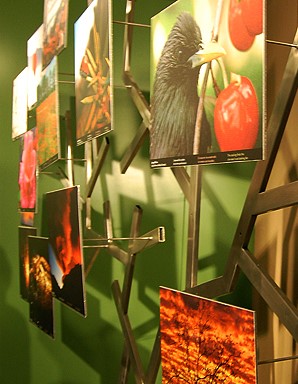 Les fotografies estan col·locades a les branques d'uns suports de metall en forma d'arbre