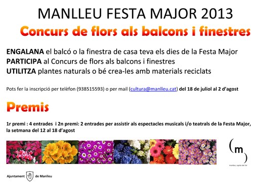 LAjuntament de Manlleu impulsa un nou concurs que convida a engalanar de flors la ciutat; els balcons i les finestres es vestiran de flors els dies de la Festa Major. Entre el 18 de juliol i el 2 dagost, cal inscriures a lÀrea de Serveis Personals, Can Puget.