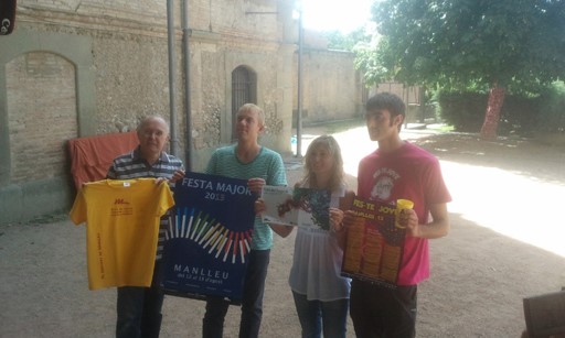 Organitzadors de la Festa Major de Manlleu amb els cartells i samarretes dels actes