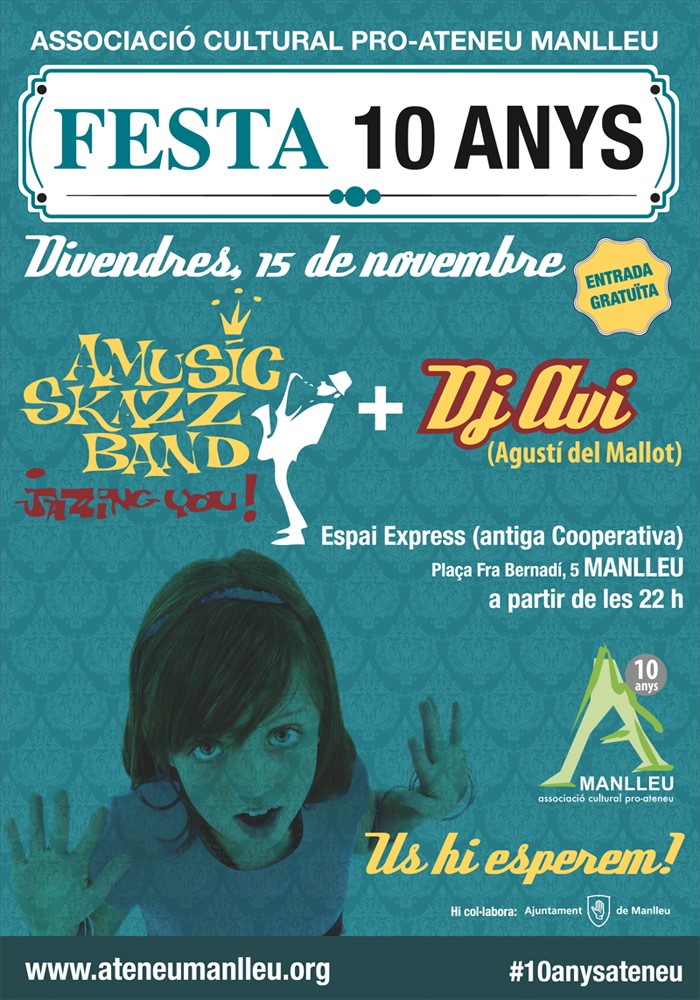 El proper divendres es farà la festa de celebració dels 10 anys de l'Associació pro Ateneu de Manlleu. La proposta comptarà amb l'actuació d'Amusic Skazz Band i Dj Avi (alter ego artístic de l'Agustí Palomares del Mallot de la Margot).