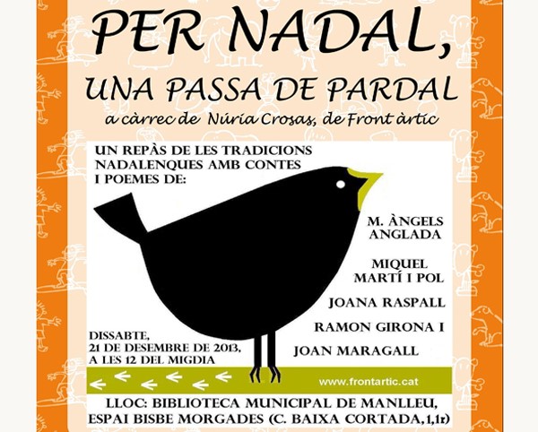 El proper dissabte dia 21 de desembre de 2013, a les 12 del migdia, la Biblioteca Municipal de Manlleu acollirà una nova edició dHora del conte. En aquesta ocasió, Núria Crosas, de Front àrtic ofereix "Per Nadal, una passa de pardal".