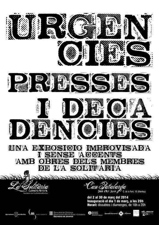 "Urgències presses i decadències" es un recull demergència, una prova per veure què es pot fer en un temps rècord. Un dels integrants del col·lectiu artístic, Jordi Tañà, diu que serà una mostra reduïda al cercle de La Solitària perquè "ho hem preparat precipitadament i els primers que hem triat han estat els del nostre col·lectiu, duns 8 o 10 artistes".
