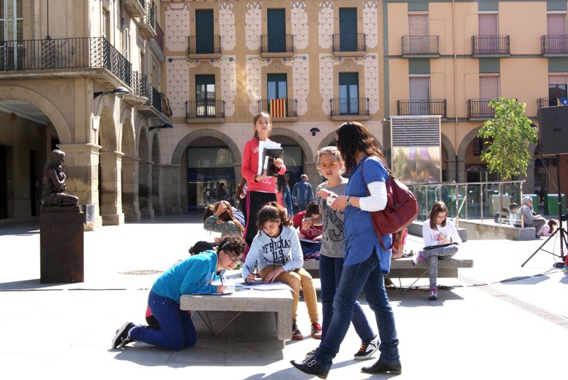 La plaça Fra Bernadí de Manlleu està en ebullició aquesta jornada de Sant Jordi, plena dels dibuixos dels infants que han participat al segon concurs de dibuix i també els més de 500 que aquesta tarda fan la ballada de sardanes i laudició. A les parades de llibres triomfen obres com La terapeuta, de Gaspar Hernández, Lanalfabeta que va salvar un país, de Jonas Jonasson o El primer heroi, de Martí Gironell.