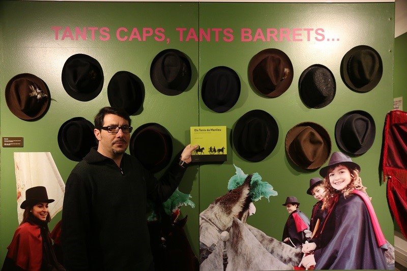 L'autor, amb el llibre, davant d'un dels plafons dela mostra que també hi ha sobre els Tonis al Museu del Ter. Foto: GFM