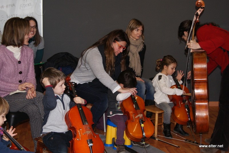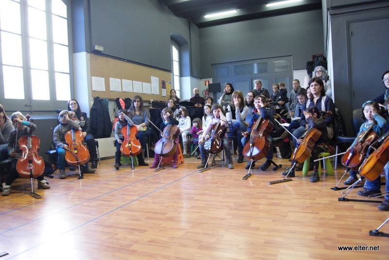 Infants ben menuts ja estan iniciats en la pràctica del violonecel seguint el mètode Suzuki