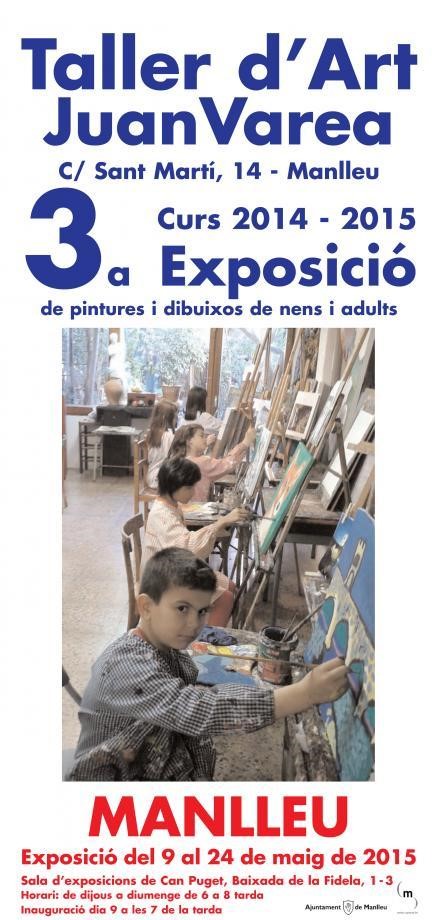 Uns 60 alumnes, entre adults, infantils i juvenils, exposaran del 10 al 24 de maig a la sala dexposicions de Can Puget (Baixada de la Fidela, 1-3) de Manlleu. Aquesta serà la 3a exposició de pintures i dibuixos de nens i adults del Taller dArt Juan Varea, una exposició molt variada tant pels temes com per les tècniques. Juan Varea porta gairebé 30 anys exercint de professor dart a la ciutat de Manlleu.