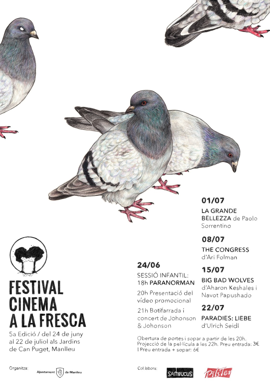 Com en les dues edicions anteriors, les portes dels jardins de Can Puget obriran a les 8 del vespre perquè sofereix la possibilitat de sopar i veure la pel·lícula gràcies a la col·laboració de les empreses manlleuenques Sambucus i Pilster en lorganització del festival. El preu de lentrada al cinema és de 3 i el pack sopar+pel·lícula, de 6. En cas de pluja les projeccions es faran al mateix recinte, a la sala dexposicions de Can Puget.