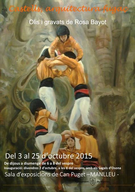 L’autora Rosa Bayot pinta des de fa quinze anys. Es va iniciar a l’Escola Masferrer de Vic del mestratge de Carles Vergés. Fa uns sis anys es va interessar pel món dels castellers, atreta per la força que li transmet aquest col·lectiu. L’exposició s’inaugurarà el divendres dia 2 d’octubre, a les 8 del vespre, i es podrà visitar fins al 25 d’octubre del 2015, a la sala d’exposicions de Can Puget (baixada de la Fidela 1-3) a Manlleu, de dijous a diumenge, de 6 a 8 del vespre.