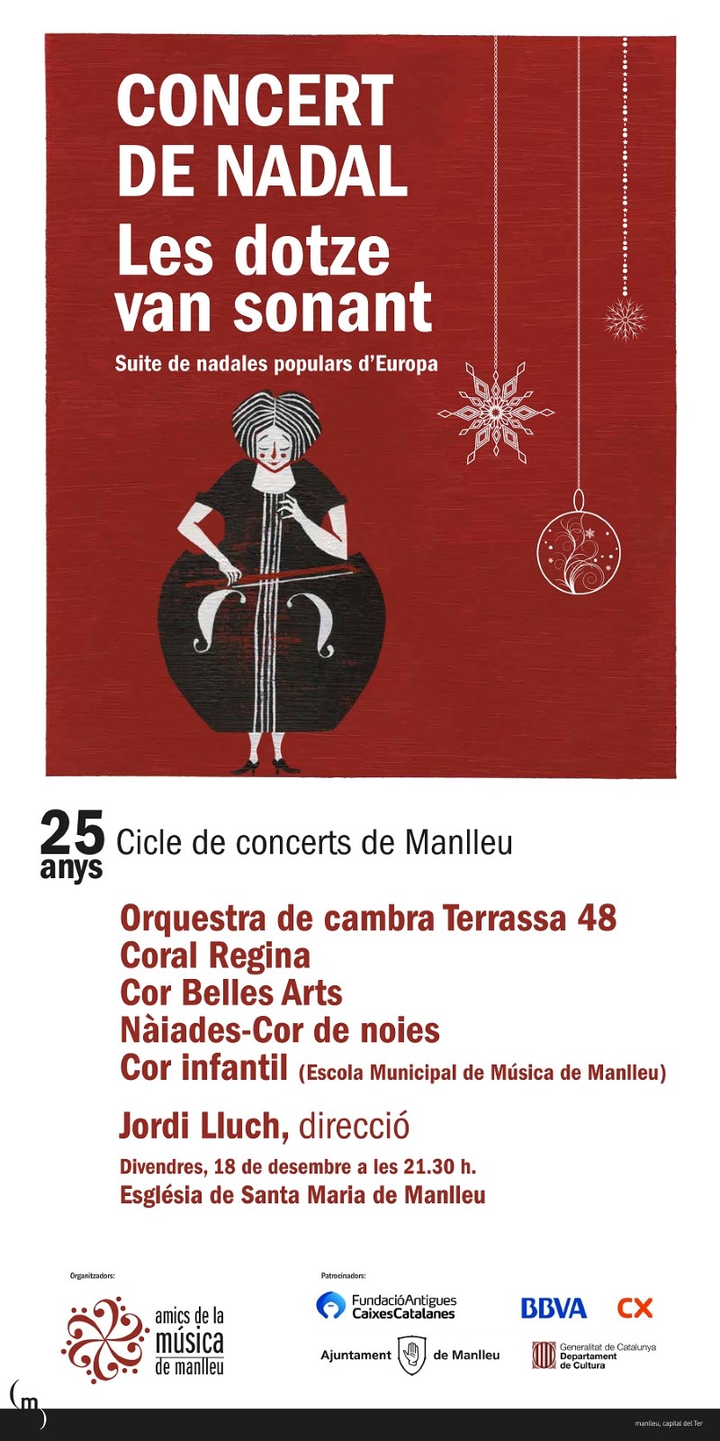 Aquest divendres 18 de desembre 2/4 de 10 del vespre tindrà lloc, a l’Església de Santa Maria de Manlleu, el tradicional concert de Nadal que organitzen els Amics de la Música de Manlleu. L’orquestra Terrassa 48, juntament amb la Coral Regina, el Cor Belles Arts de Sabadell, Nàiades Cor de Noies i un cor de l’Escola municipal de Música de Manlleu interpretaran la suite de Nadal “Les dotze van sonant”.