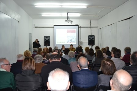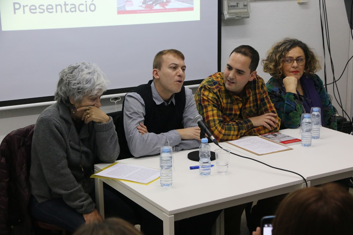 La professora Anna Piella, el poeta Sergi Oliva, l'alcalde Àlex Garrido i l'editora Neus Escandell en una sala plena