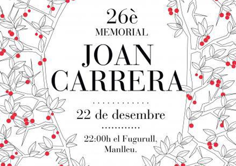 Aquest dimarts 22 de desembre a les 10 de la nit se celebra el 26è memorial de poesia Joan Carrera a l’ermita del Fugurull de Manlleu. Amb la participació de diferents actuacions artístiques, com és habitual en aquest esdeveniment anual.