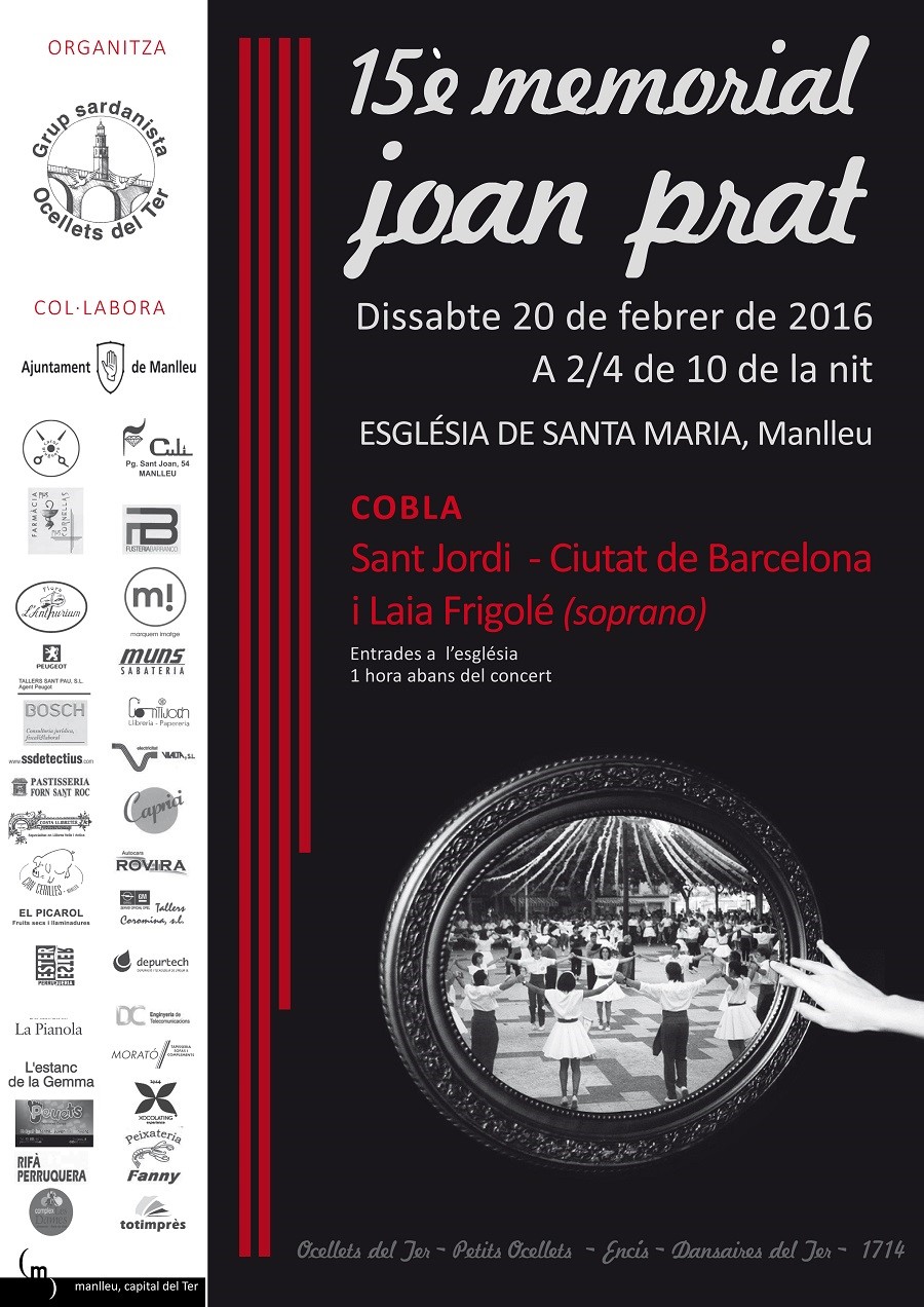Manlleu acollirà dissabte vinent la 15a i última edició del Memorial Joan Prat. El concert anirà a càrrec de la cobla Sant Jordi-Ciutat de Barcelona sota la direcció de Marcel Sabaté, amb la participació de la soprano Laia Frigolé. El Memorial Joan Prat, creat el 2002 pel Grup Sardanista Ocellets del Ter, homenatja la figura del qui fa ser fundador i ànima del grup sardanista manlleuenc.