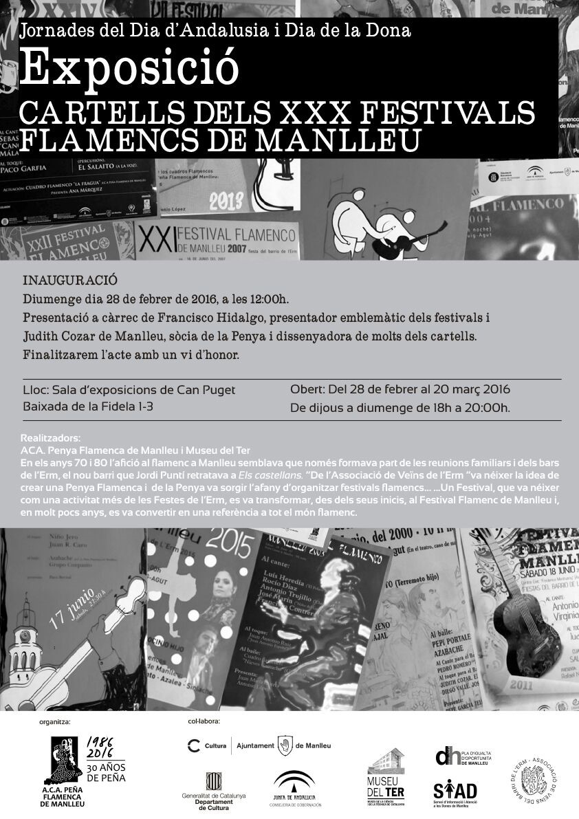 Aquest diumenge 28 de març al migdia s’inaugurarà l’exposició de Cartells dels 30 festivals flamencs de Manlleu en motiu de la celebració del trentè aniversari de la Penya Flamenca de Manlleu. La presentació es farà a les 12 del migdia a la Sala d’exposicions de Can Puget i comptarà amb la presència de membres emblemàtics de l’Associació.