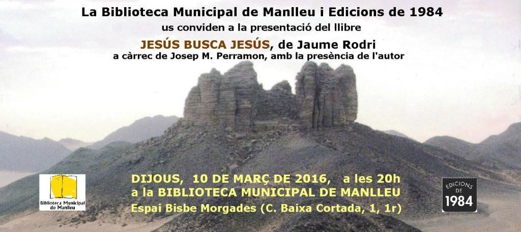 Aquest dijous a les 8 del vespre, Josep Maria Perramon presentarà l’obra de Jaume Rodri, escriptor, artista i polític vigatà, titulada Jesús busca Jesús. Rodri explica que s'ha interessat per qui ha estat "un dels personatges més controvertits de la història, que no va escriure mai res i del que va dir, res no ha pogut ser contrastat".
