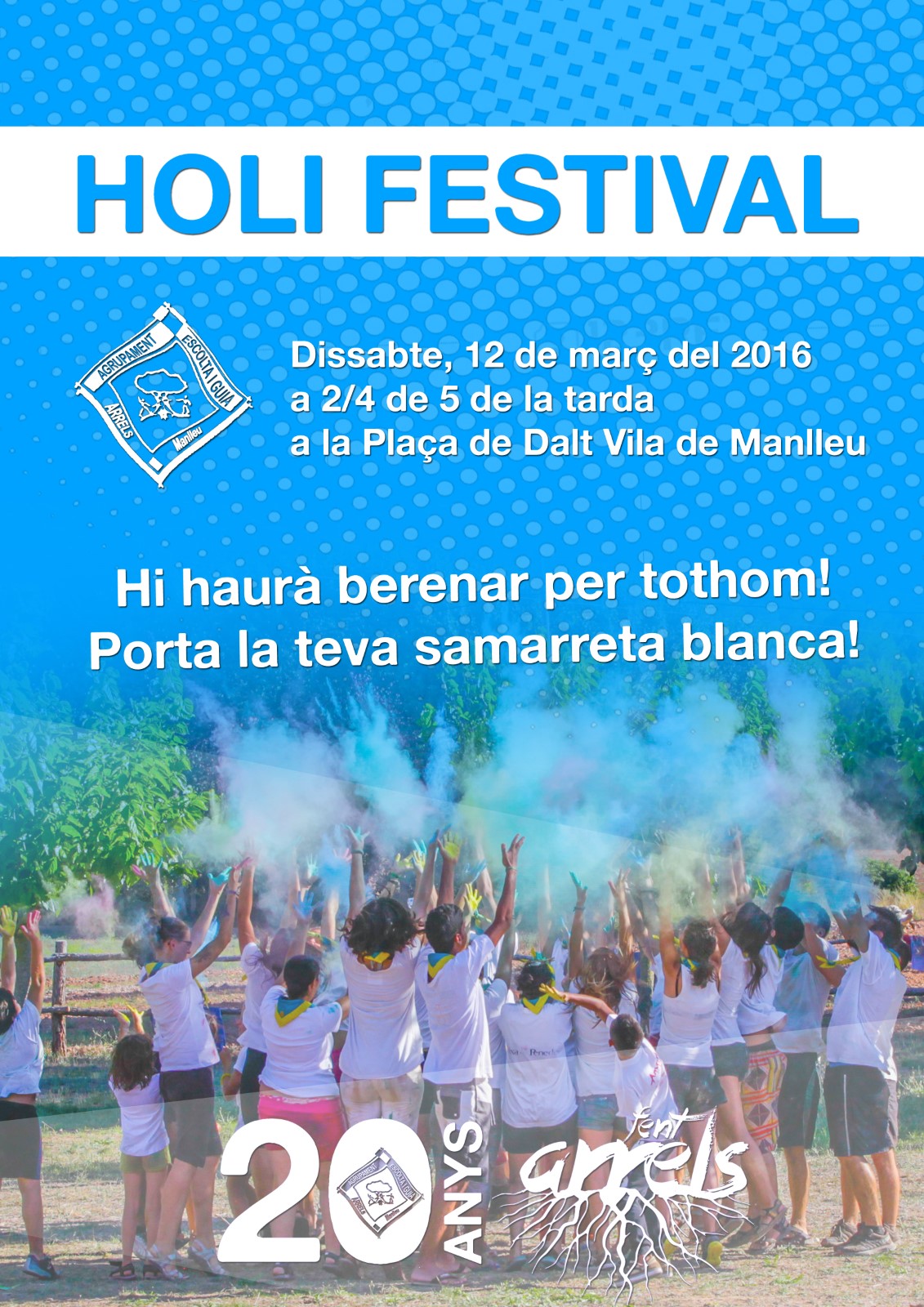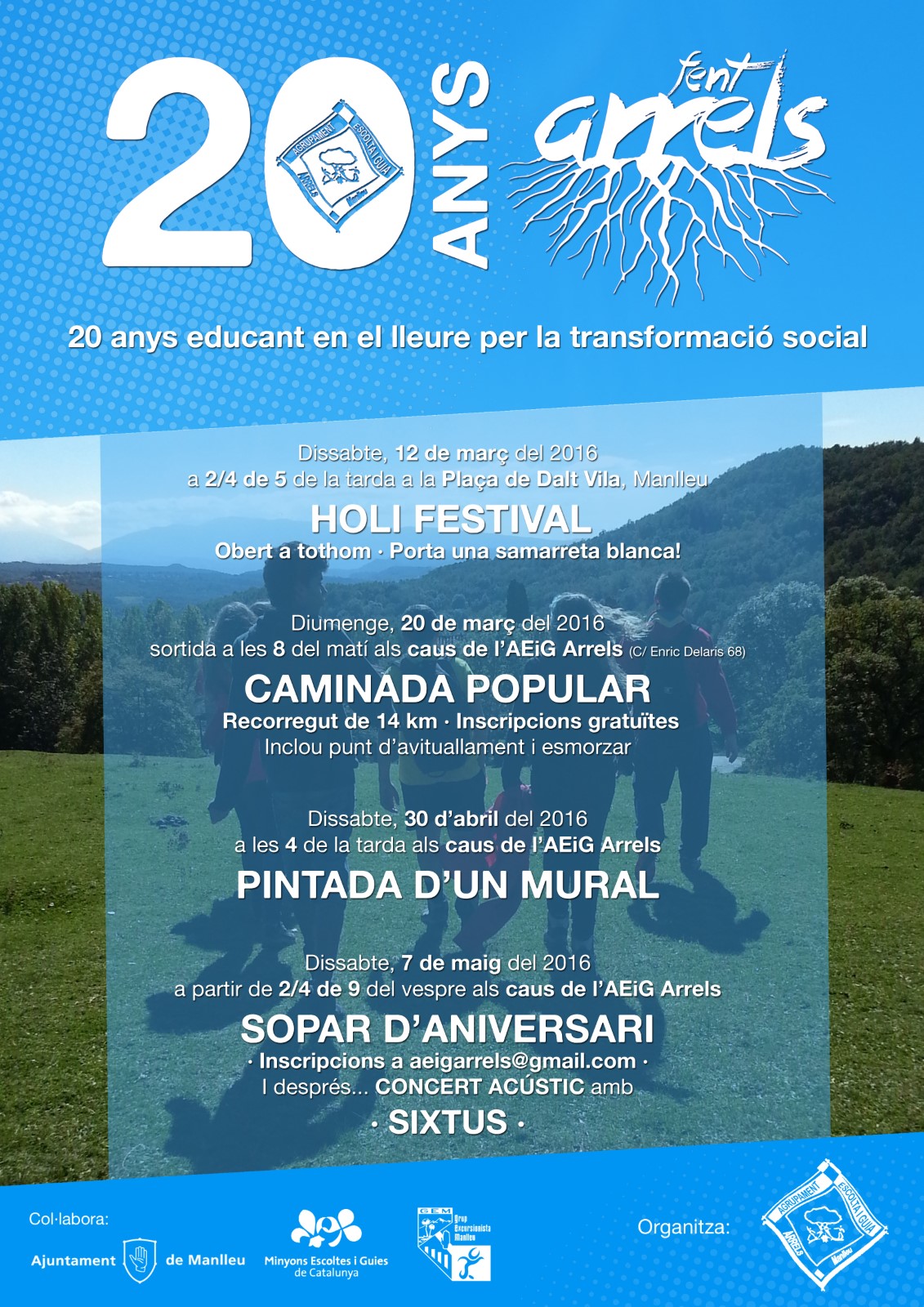 L’Agrupament Escolta i Guia Arrels de Manlleu celebra el 20è aniversari de la fundació organitzant diversos actes oberts a tota la població. El primer d'ells, un ‘holi festival’ que tindrà lloc demà a la tarda a la Plaça de Dalt Vila, a partir de 2/4 de 5 de la tarda. En declaracions a Ràdio Manlleu, Gerard Vallejo, membre de l'equip de caps de l'Agrupament, ha explicat que l'acte "consistirà en diferents activitats amb pols de colors" i, per això, demanen a tothom que hi assisteixi que porti una samarreta blanca.
