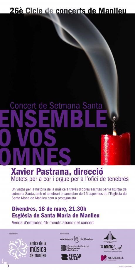 El 26è cicle de concerts dels Amics de la Música de Manlleu continua aquest cap de setmana. Aquest divendres a 2/4 de 10 del vespre, tindrà lloc a l’Església de Santa Maria de Manlleu un concert a càrrec del Cor Ensemble O Vos Omnes, dirigit per Xavier Pastrana.