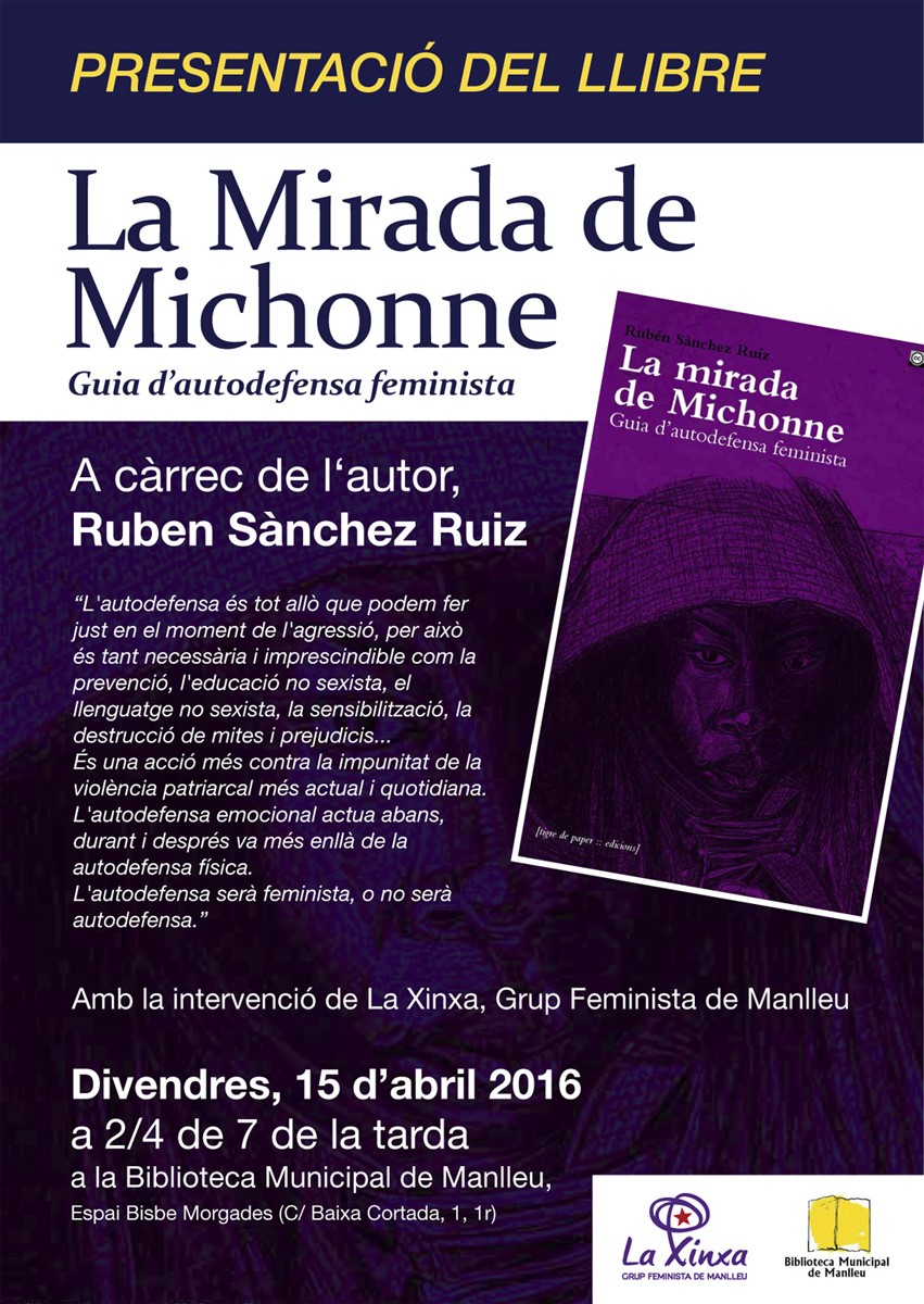 El Grup Feminista de Manlleu, La Xinxa, ha organitzat per aquest divendres la presentació d’un llibre enfocat a l’autodefensa feminista. El llibre rep el títol de "La Mirada de Michonne", de l’autor Rubén Sànchez Ruiz i serà el mateix autor qui farà la presentació d’aquesta guia. Sànchez Ruiz sempre ha estat vinculat en la lluita feminista i és un dels principals impulsors de la creació de grups d’homes per treballar la relació del patriarcat. Belén Herrero integrant de la Xinxa així ho explicava.