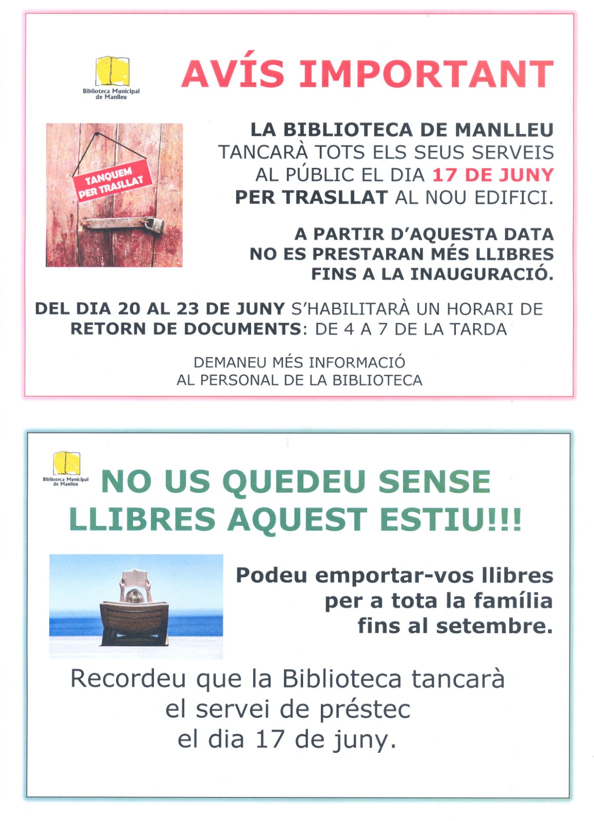 Fulls informatius del tancament de la Biblioteca. Foto: Ajuntament de Manlleu