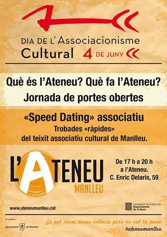 L’Ateneu de Manlleu se suma aquest dissabte als actes del Dia de l’Associacionisme Cultural. De 5 a 8 de la tarda hi haurà un “speed dating” d’entitats culturals de Manlleu.