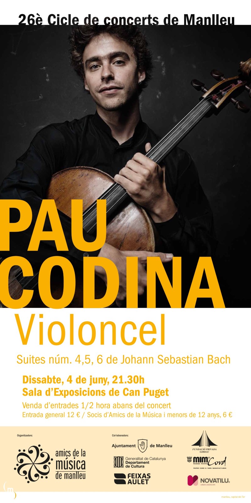 El violoncel·lista Pau Codina serà el protagonista del segon concert de les Suites de Bach, organitzat pels Amics de la Música de Manlleu. Serà aquest dissabte a 2/4 de 10 del vespres a la Sala d’Exposicions de Can Puget quan l’artista interpretarà les Suites número 4, 5 i 6 completant així la integral de la gran obra per violoncel de Johann Sebastian Bach. Un altre gran músic, Lluís Claret, va interpretar en el primer concert les Suites número 1, 2 i 3.