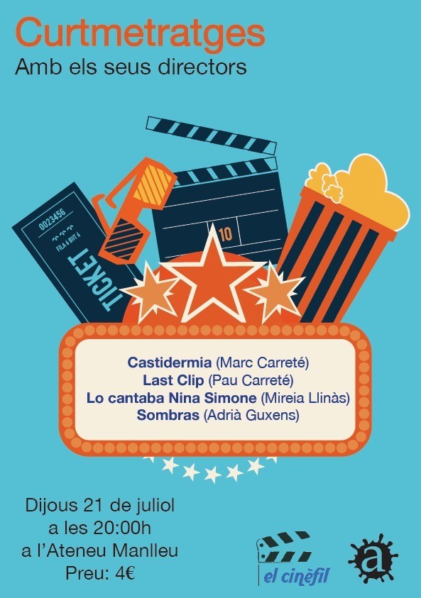 Les Jornades d’Estiu culturals organitzades per L’Escriba el juliol finalitzen aquest dijous, 21, amb la projecció de quatre curtmetratges de l’ESCAC, l’Escola Superior de Cinema i Audiovisuals de Catalunya, a l’Ateneu de Manlleu. Serà a partir de les 8 del vespre i comptarà amb la presència dels seus quatre directors, Marc Carreté, Pau Carreté, Mireia Llinàs i Adrià Guxens.