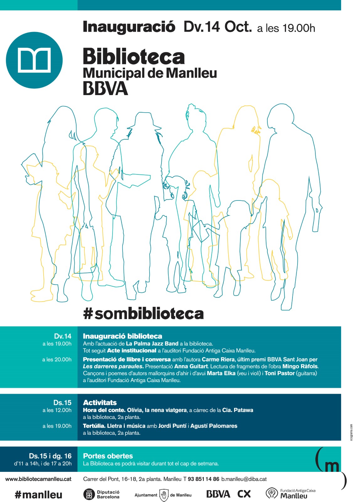 El proper divendres 14 d’octubre es farà oficialment la inauguració de la nova Biblioteca Municipal de Manlleu, amb l'entrada pel carrer del Pont i en un local cedit pel BBVA. A l’obertura hi actuarà La Palma Jazz Band i també s’ha previst la presentació del llibre Les darreres paraules i una conversa amb l’autora, Carme Riera.