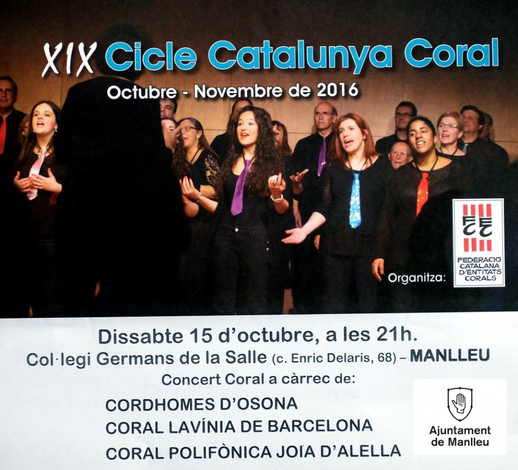 El concert, que es farà a l’Església del Col·legi La Salle de Manlleu, es un dels que s’organitzen en cada una de les onze demarcacions en que està subdividida la Federació Catalana d’Entitats Corals. Al concert hi participaran el Cordhomes, de la demarcació d’Osona, la Coral Lavínia, de la demarcació del Barcelonès, i la Coral Polifònica Joia d’Alella, de la demarcació del Maresme.