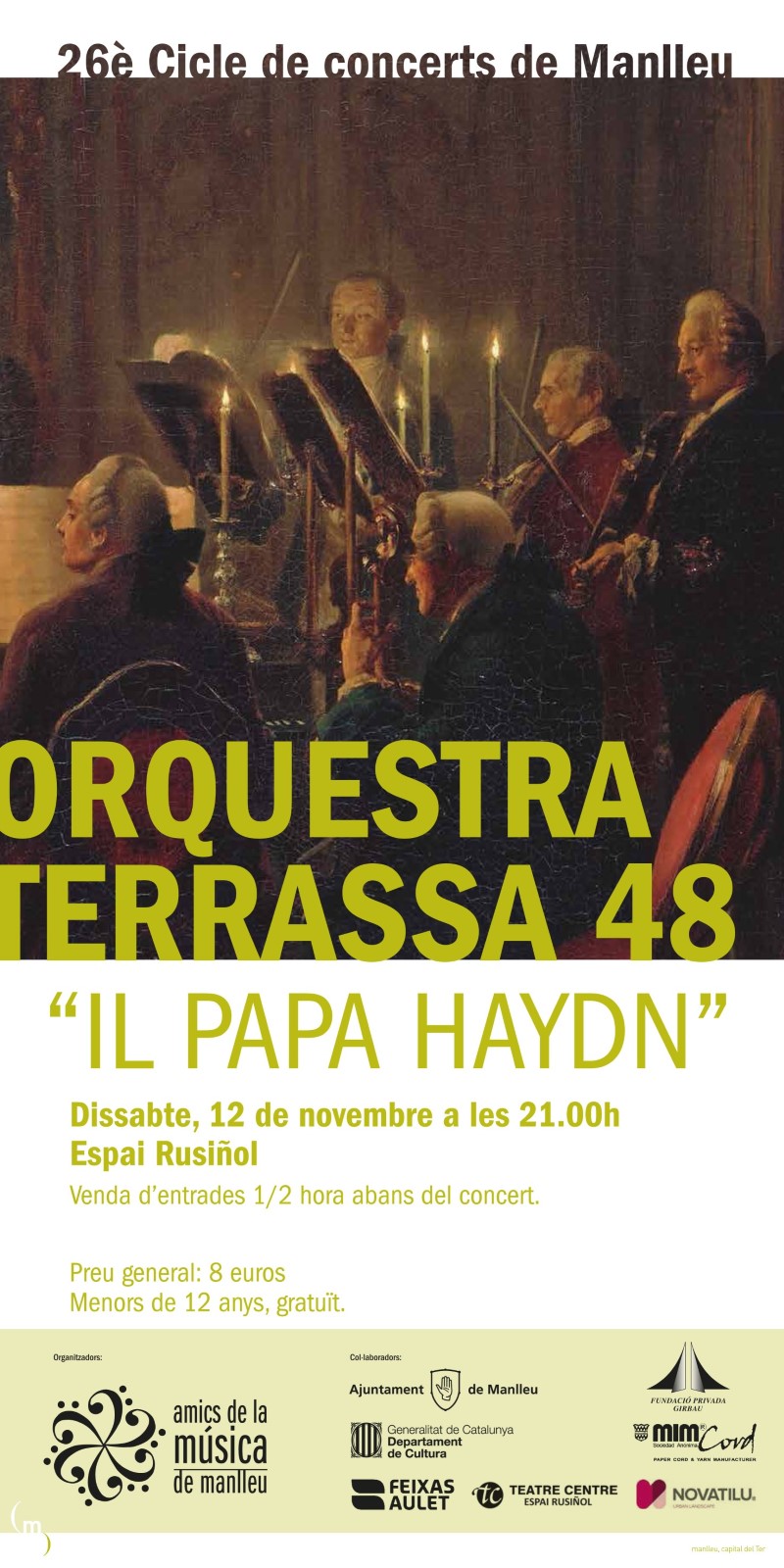 L’Espai Rusiñol torna a obrir les seves portes aquest dissabte 12 de novembre per acollir l’Orquestra Terrassa 48. La vint-i-sisena edició del Cicle d'Amics de la Música de Manlleu 2016 arrenca amb l'últim tram de la temporada amb el concert "Il papa Haydn".