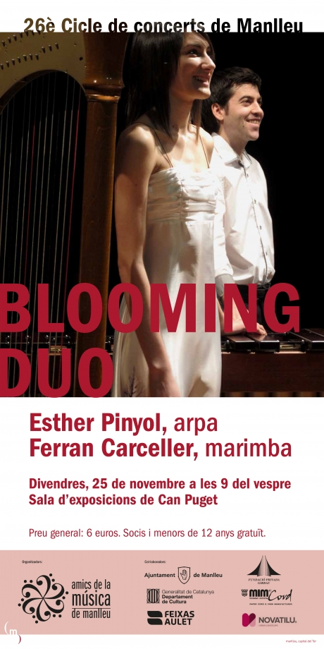 Blooming duo unirà dos instruments amb aura, l’arpa i la marimba, en un concert aquest divendres a Manlleu. L'actuació, organitzada pels Amics de la Música de Manlleu, la protagonitza un duet format per l’arpista Esther Pinyol i el percussionista Ferran Carceller. Tocaran a les 9 del vespre, a la sala d’exposicions de Can Puget.