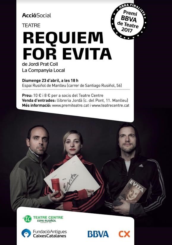 Aquest diumenge 23 d’abril, l’Espai Rusiñol té l’oportunitat d’acollir una de les obres finalistes de l’edició d’enguany del Premi BBVA de Teatre, el musical Réquiem for Evita. D’unes 70 obres presentades, la proposta de la Companyia Local, dirigida per Jordi Prat Coll, es troba entre les 6 triades pel jurat. A la gala final, prevista pel 22 de maig a l’Atlàntida de Vic, es donarà a conèixer l’obra guanyadora.