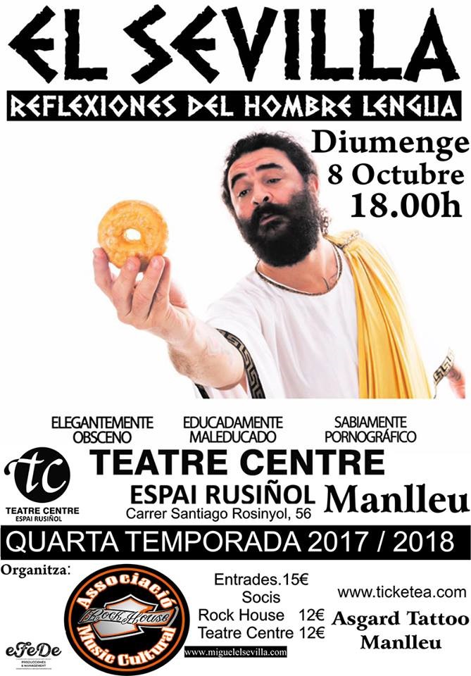 El proper diumenge 8 d’octubre Miguel El Sevilla actuarà a l'Espai Rusiñol de Manlleu amb la seva obra d'humor Reflexiones del Hombre Lengua, que començarà a les 6 de la tarda.