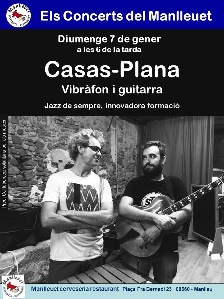 La cerveseria-restaurant el Manlleuet proposa després de Reis, aquest diumenge a les 6 de la tarda, un concert de jazz format pel duo de músics Casas-Plana, que casaran el vibràfon i la guitarra. L’esdeveniment és gratuït, però els assistents poden fer col·laboracions voluntàries pels músics.