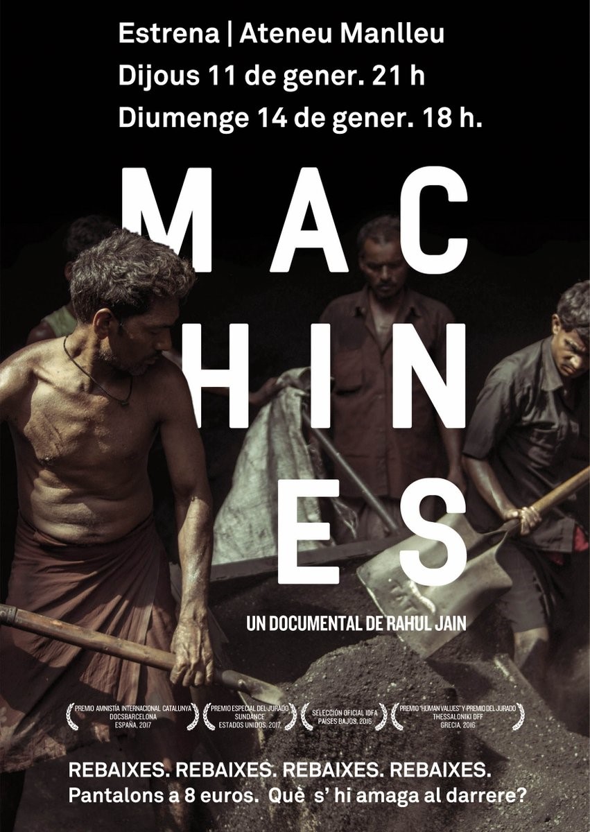 DocsBarcelona presenta “Machines”, el primer documental del cineasta indi Rahul Jain, i que es projectarà en una doble sessió a l’Ateneu de Manlleu dijous a les 9 de la nit i diumenge a les 6 de la tarda. Un treball que va rebre el Premi Amnistia Internacional Catalunya a la passada edició del festival DocsBarcelona i que la revista "Rolling Stone" ha escollit com un dels 10 millors documentals del 2017.