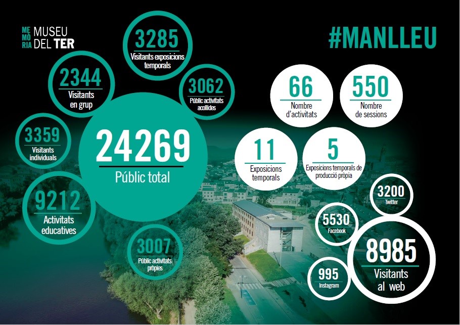 El Museu del Ter de Manlleu tanca l’any 2017 amb un públic total de 24.269 persones. D’aquestes més de vint mil persones, 3359 han estat visitants individuals, 9212 s’han adreçat al museu gràcies a activitats educatives i 3007 a activitats pròpies. Cal destacar que 2344 han estat visites en grup, 3285 visitants d’exposicions temporals i 3062 públic d’activitats acollides.