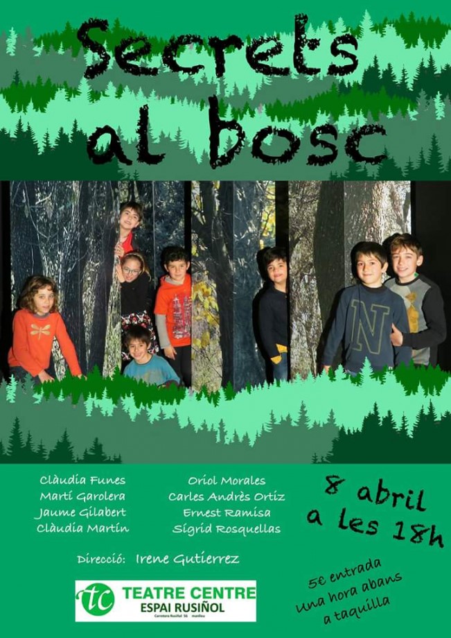 El grup del taller de teatre del Teatre Centre, format per nens i nenes de 6 a 9 anys, representarà aquest diumenge a les 6 de la tarda la funció “Secrets al bosc” a l’Espai Rusiñol. Dirigida per Irene Gutiérrez, tindrà un preu de 5 euros, i és una obra de creació pròpia.
