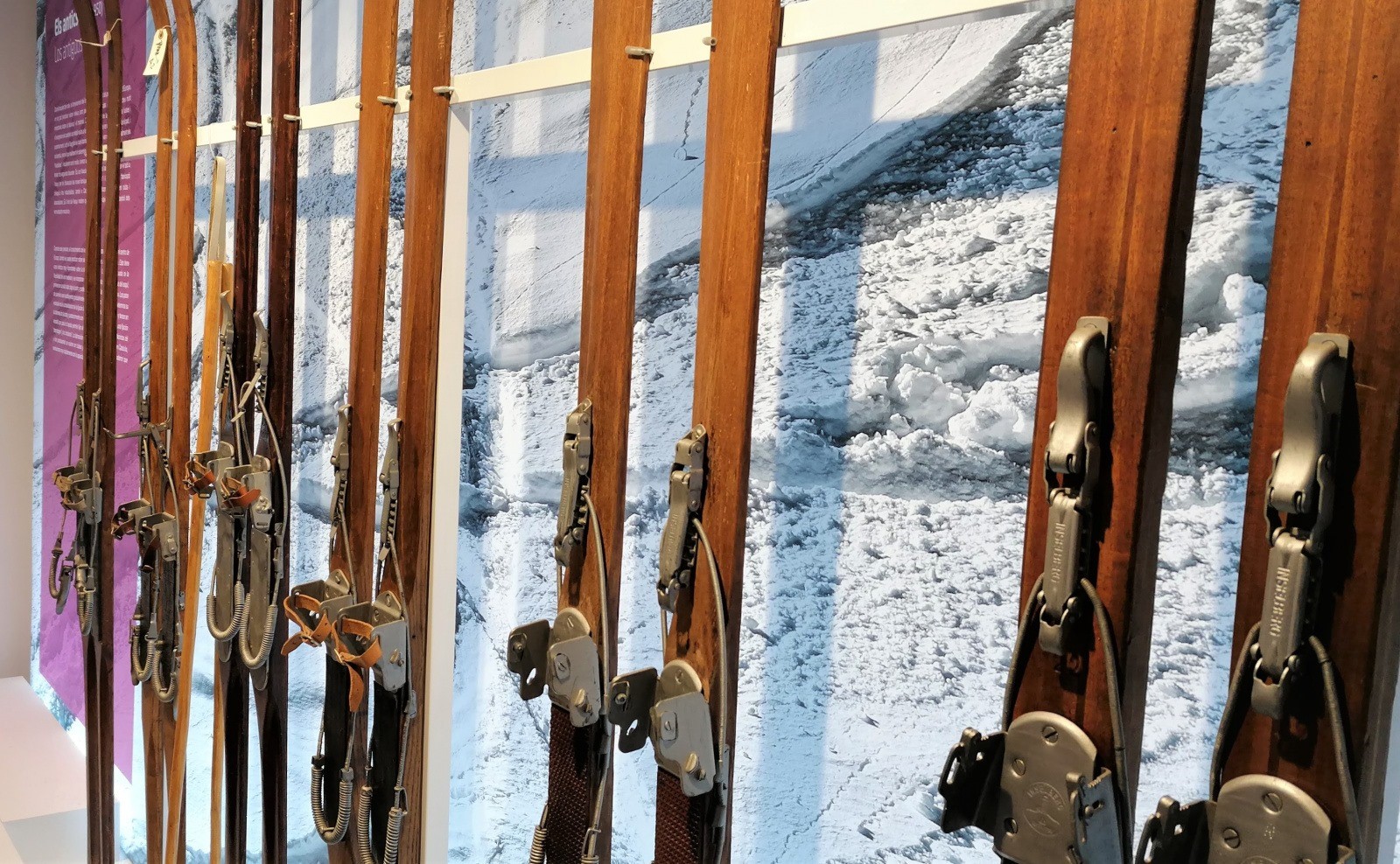 L’exposició es divideix en quatre àrees diferents, que separen el contingut de forma cronològica. El viatge comença el 1880 amb els primers esquiadors i esquiadores, segueix amb les innovacions i la popularització de principis del segle XX, passa per l’època daurada de l’esquí a Núria dels anys cinquanta i acaba a l’actualitat, amb dissenys millorats i equipament esportiu fet amb materials diversos com la fibra de vidre o de carboni.
