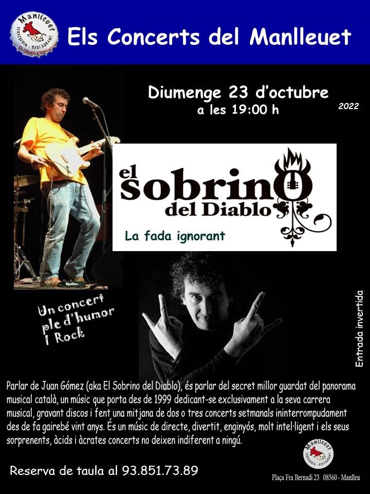 La cerveseria restaurant Manlleuet ha informat dels artistes i les properes dates en què s’oferiran concerts de diumenge a les set del vespre. La propera sessió serà aquest proper diumenge, 23 d’octubre, i el concert serà d’El Sobrino del Diablo. El cantautor portarà el seu humor satíric quan acumula ja una trajectòria de 23 anys de concerts en directe.