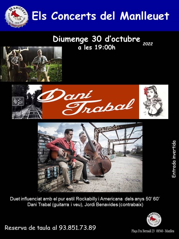 La setmana següent, el diumenge 30 d’octubre, serà el torn de Dani Trabal Duo, en un concert que oferirà, amb dues guitarres, versions i temes propis amb estils de les dècades dels 50s i 60s.