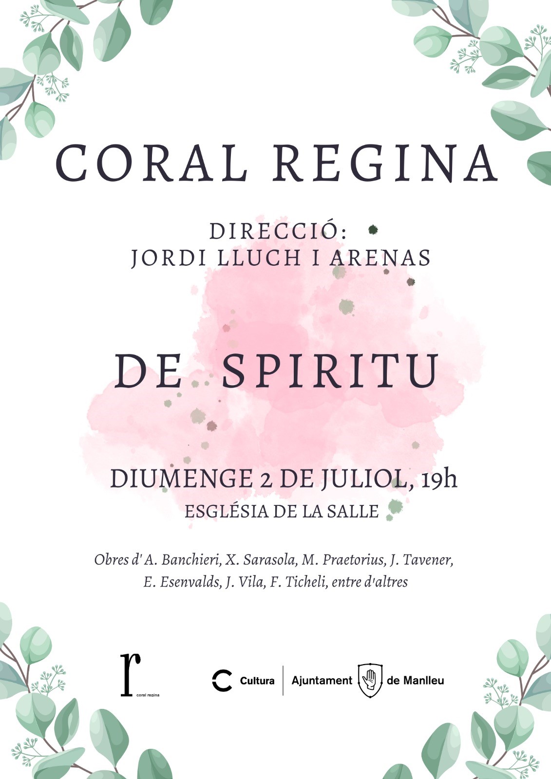 Diumenge 2 de juliol, a les 19 h, l’església de La Salle de Manlleu acollirà el concert “De Spiritu” de la Coral Regina. El preu de l’entrada serà per taquilla inversa