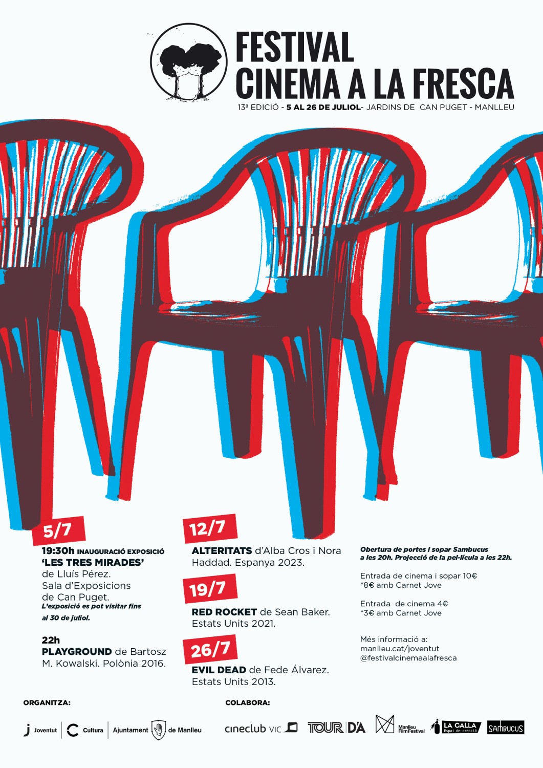 Totes les sessions es realitzaran als Jardins de Can Puget, a les 20 h es farà l’obertura de portes i el sopar i a les 22 h es projectarà la pel·lícula. El preu de l’entrada són 4 euros, 3 € amb el carnet Jove, en cas de voler sopar la tarifa són 10 € i 8 € amb el carnet Jove.