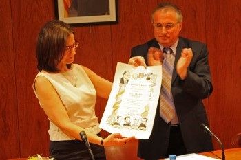 Moment del lliurament a la familia del diploma que dóna fe de l'homenatge a Pere Farrés i Arderiu