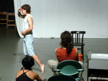 Un assaig amb la professora Marta Esmarats i els alumnes Marc Costa i Rocio Melo
