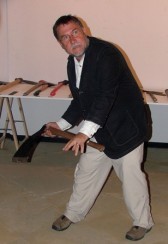 El naturalista, Martí Boada, explica com es feia el tallat amb una de les destrals de l´exposició