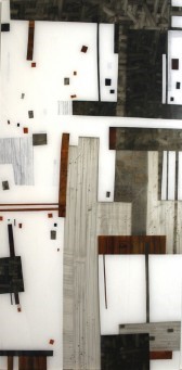Lartista ha sobreposat dues peces creant un efecte tridimensional. Les peces estan pintades amb pintura acrílica en tons de blanc, gris i negre.